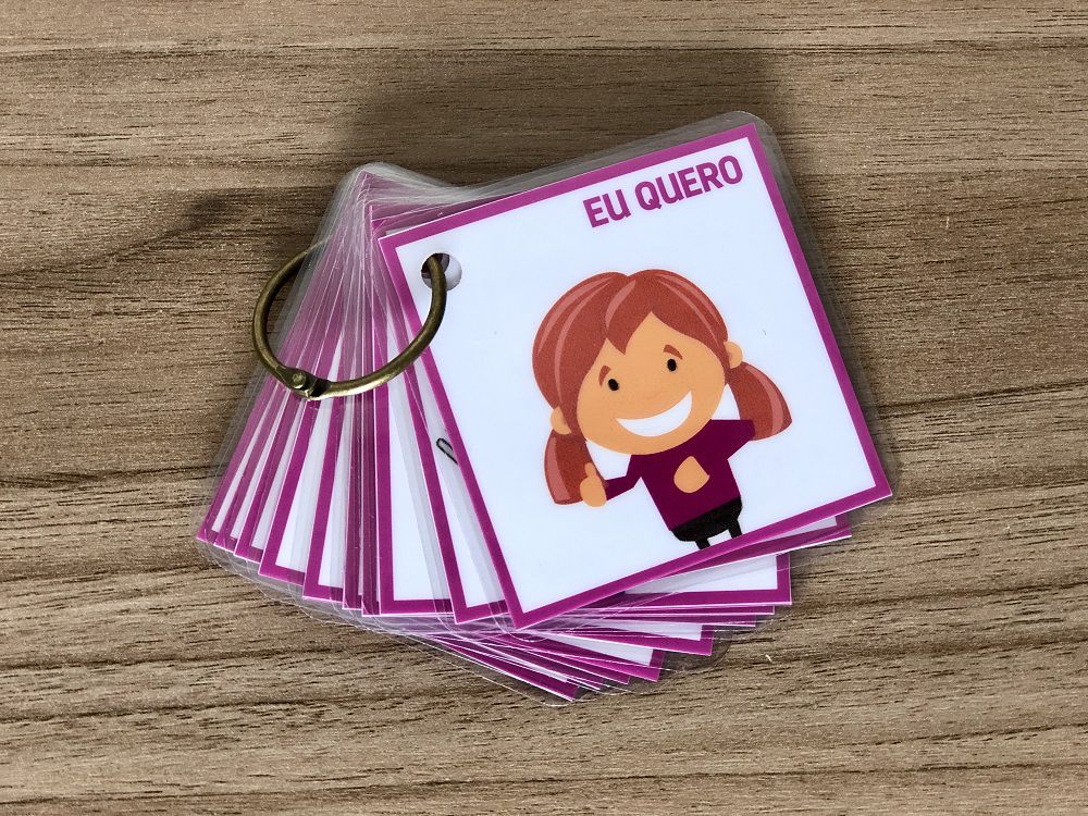 ✔ 10 cartas ilustradas com palavras-chave como "Eu quero", "Ajuda", "Banheiro", "Casa" e "Comer".