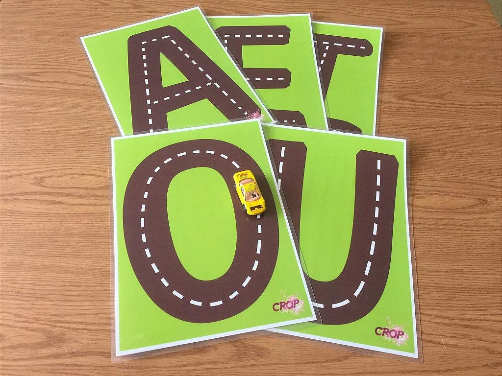 - Peça para a criança guiar o carrinho pelas pistas, nomeando cada vogal ao passar por ela.