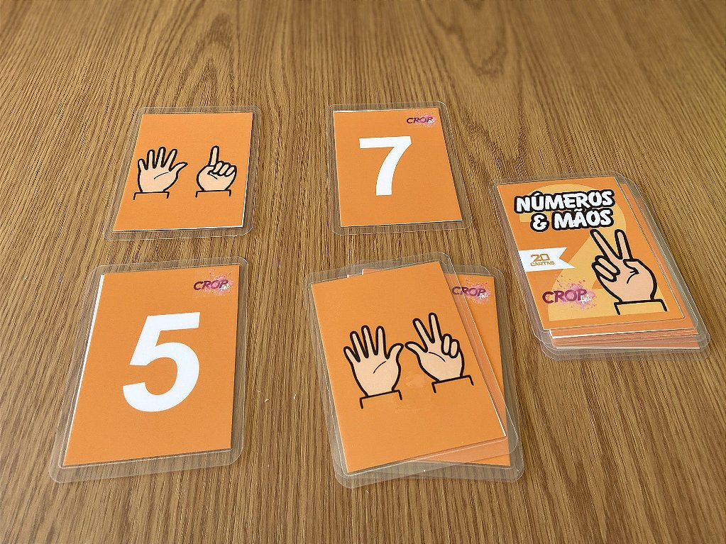 Números e Mãos II: Neste jogo vamos trabalhar de forma interativa a contagem dos números, usando as mãos como facilitador na hora de somar os dedinhos! De um lado a carta mostra os números em bastão e do outro lado da carta, as mãos simbolizando o número. Mostramos os números em bastão para a criança e solicitamos que ela nos mostre nos dedinhos o mesmo número! Viramos a carta e parabenizamos a criança.