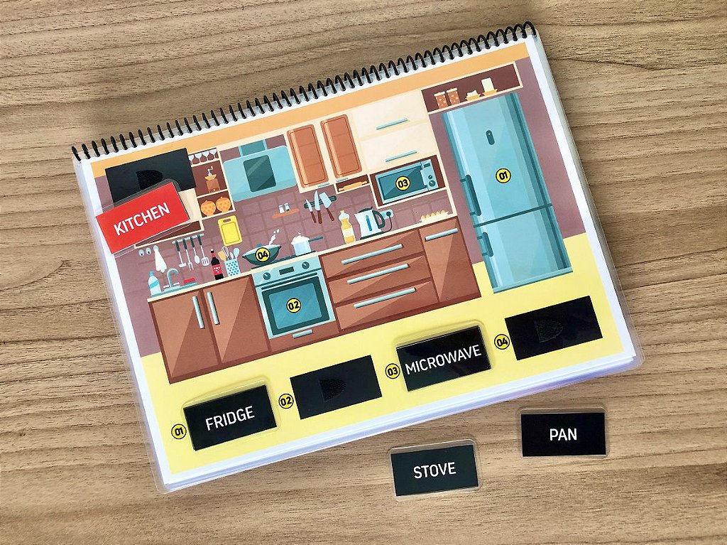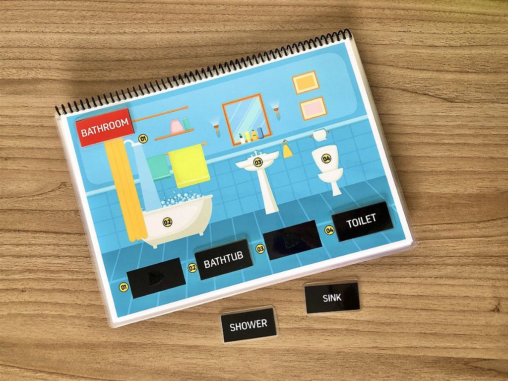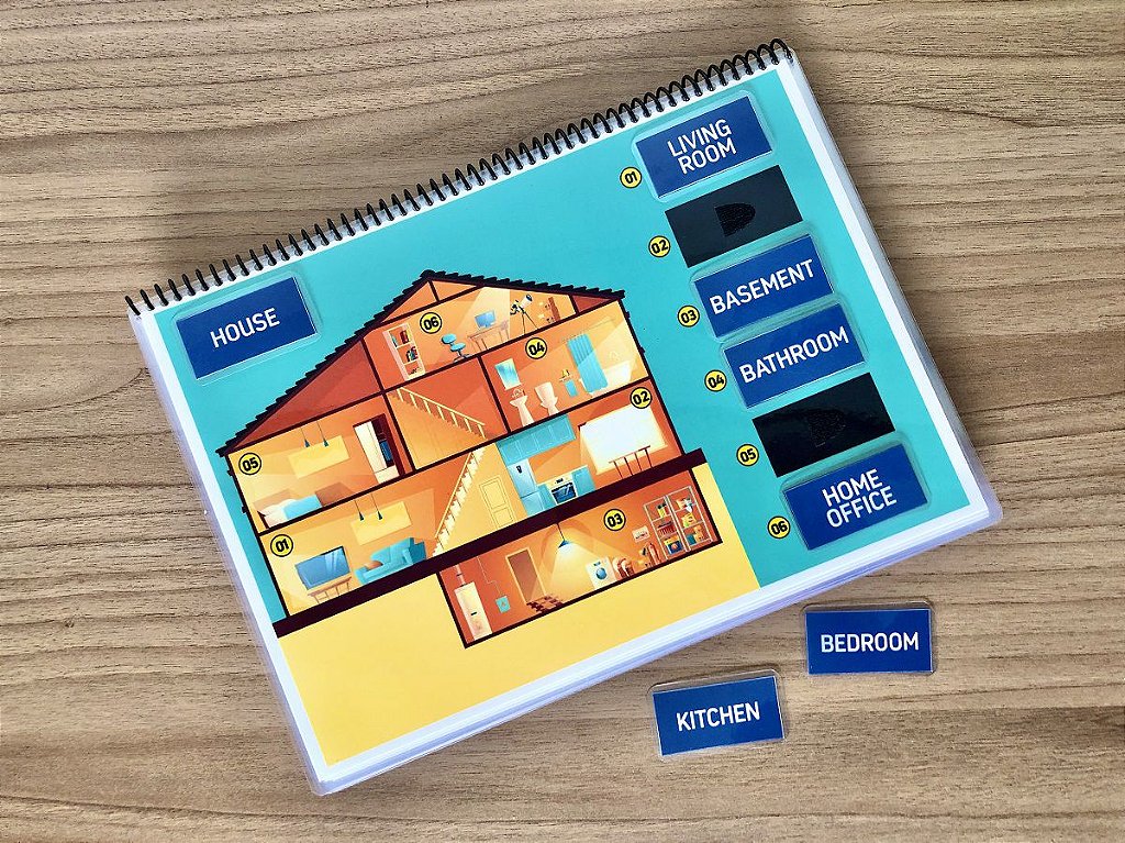 ✔ Nomes dos cômodos e mobílias em inglês, para que a criança associe corretamente os termos.