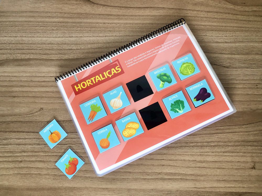 - Ensina de forma lúdica e visual, ajudando a criança a identificar os alimentos e sua importância.