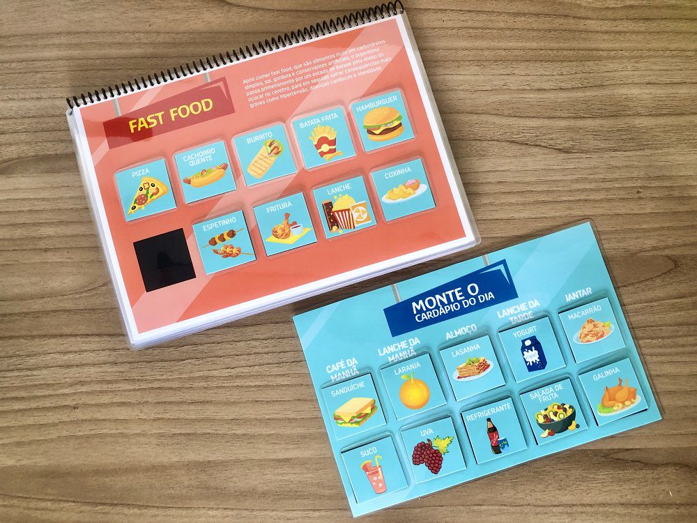 No final do livro, há uma plaquinha destacável onde a criança pode montar o Menu do Dia, organizando as refeições: