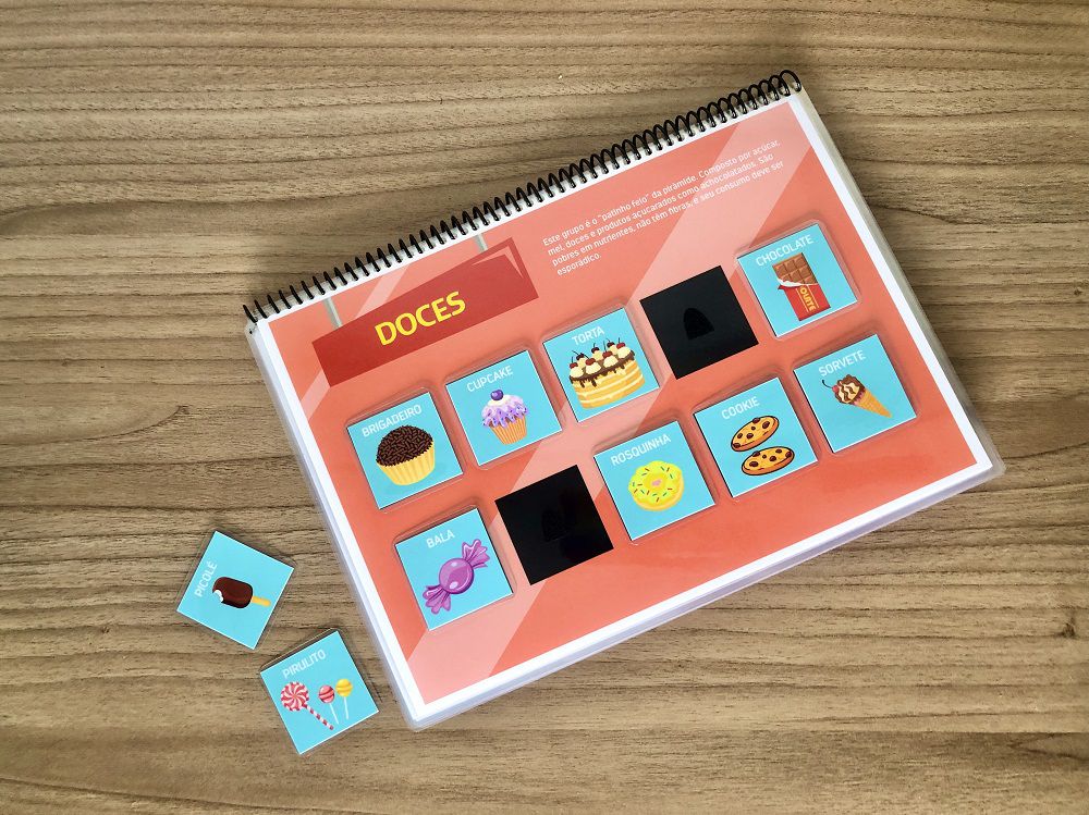 ✔ 80 peças removíveis com velcro, permitindo categorizar os alimentos de forma prática e intuitiva.