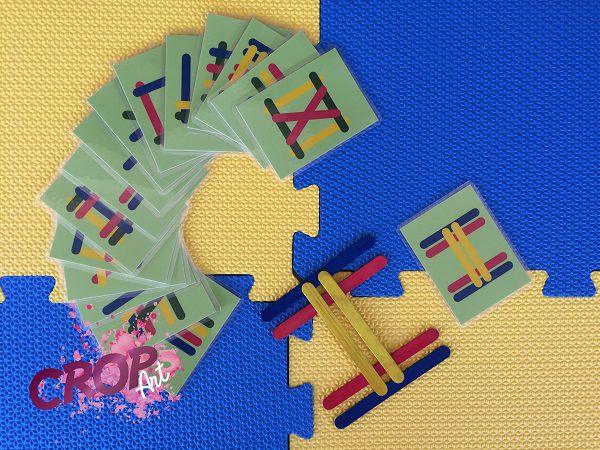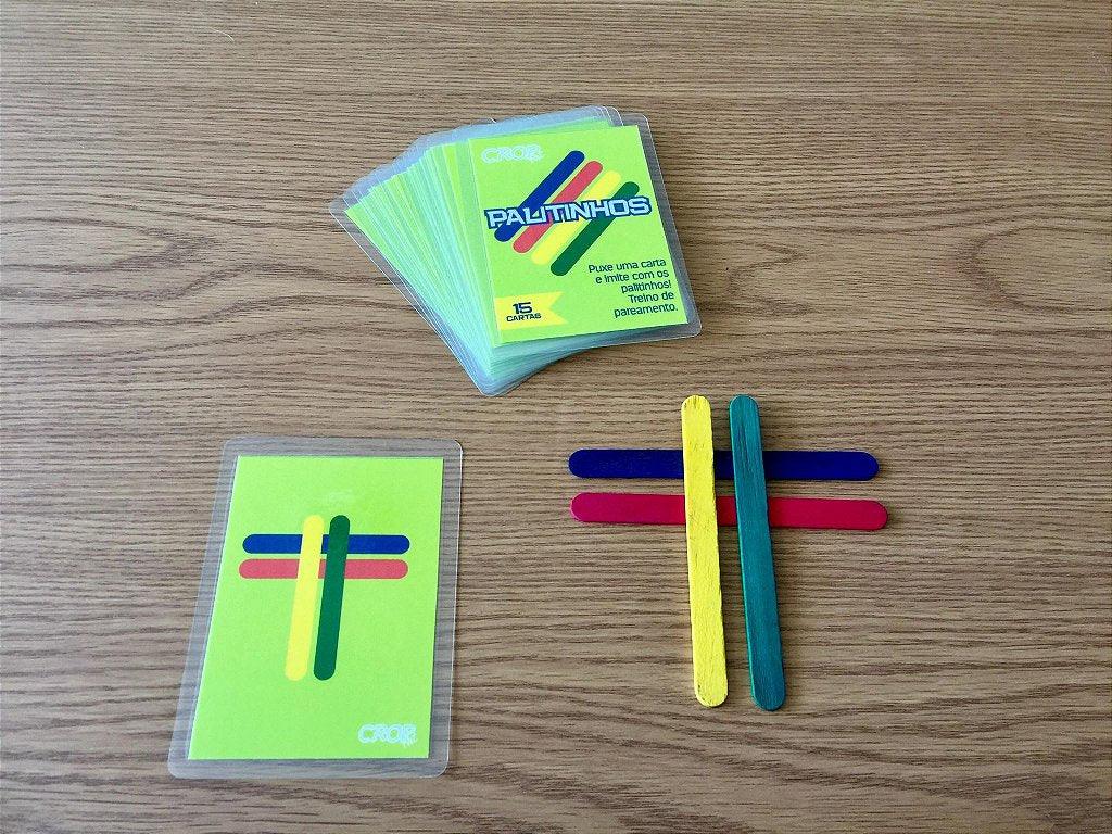 O joguinho Palitinhos é um dos nossos queridinhos! Ele acompanha 15 cartas com uma imagem, que deverá ser construída ao lado com os palitinhos de madeira. O exercício deverá respeitar a ordem dos palitinhos, assim como as cores correspondentes.