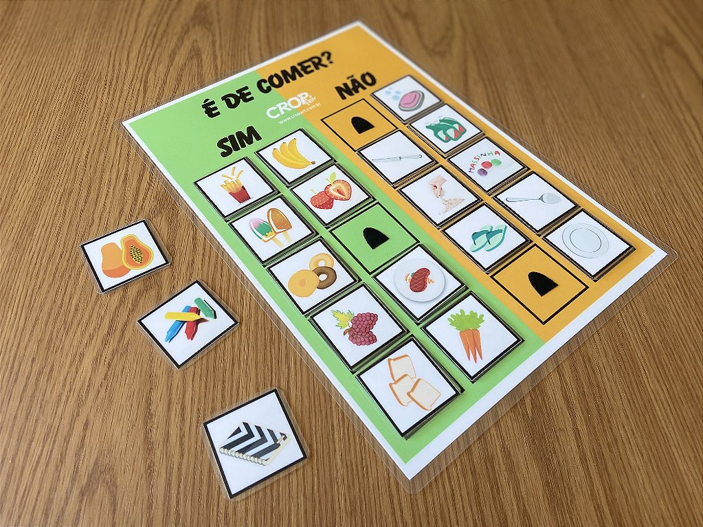 A Placa "É de Comer?" é uma atividade lúdica e educativa que auxilia no desenvolvimento cognitivo das crianças ao ensinar a identificação de alimentos e objetos não comestíveis. Com 24 imagens ilustradas, a criança aprende a separar os itens corretamente, reforçando sua compreensão sobre o que pode ou não ser ingerido.